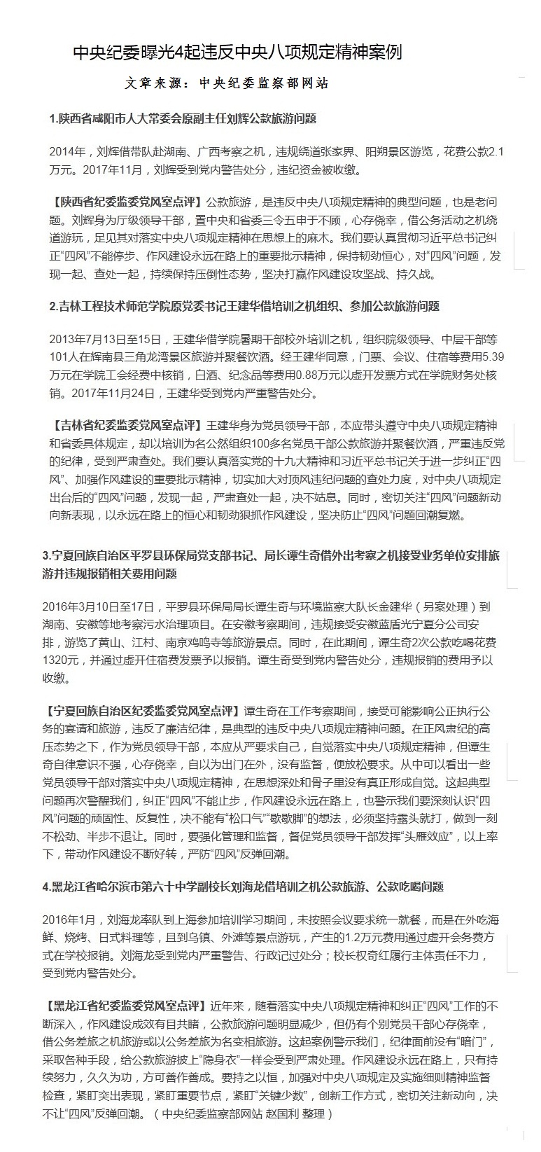 中央纪委曝光4起违反中央八项规定精神案例
