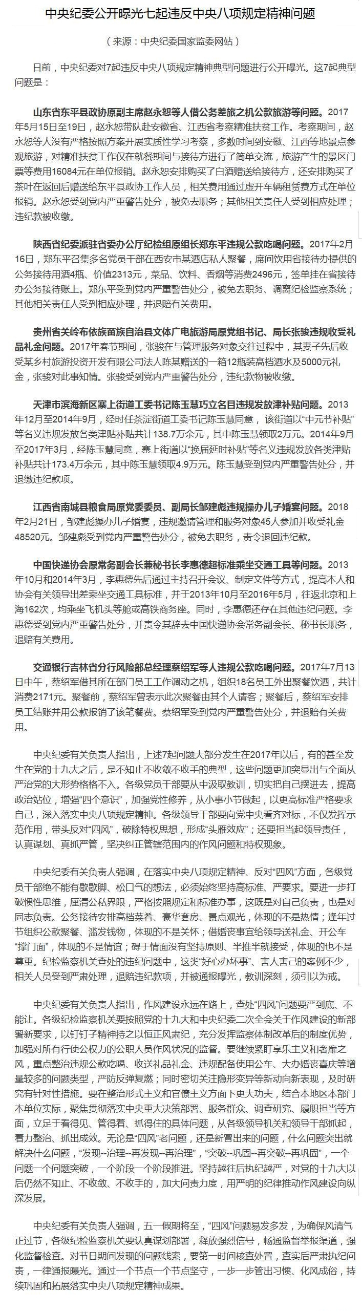 中央纪委公开曝光七起违反中央八项规定精神问题